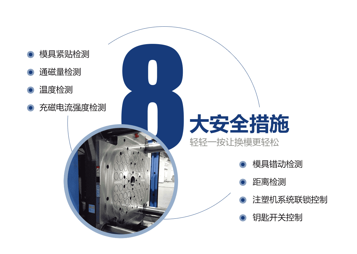 電永磁磁力模板只需一名操作員,無需其他工具,就可以在距注塑機(jī)安全距離的磁力系統(tǒng)上執(zhí)行操作。 大大降低人工成本和勞動(dòng)強(qiáng)度。